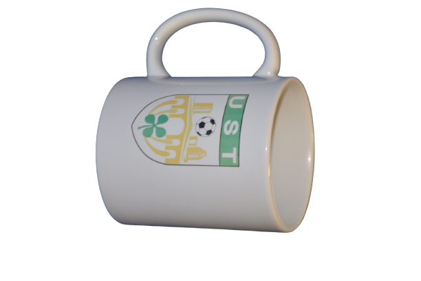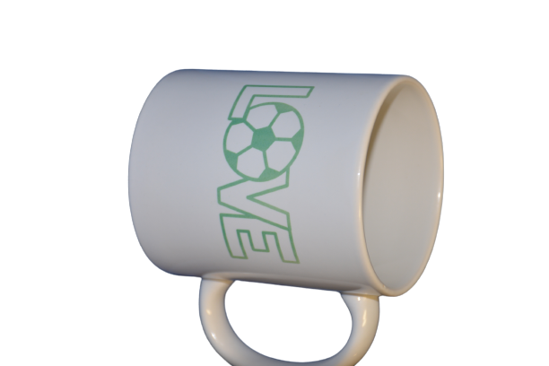 Un mug avec logo du club ainsi que l'inscription "LOVE" en vert au dos de la tasse.